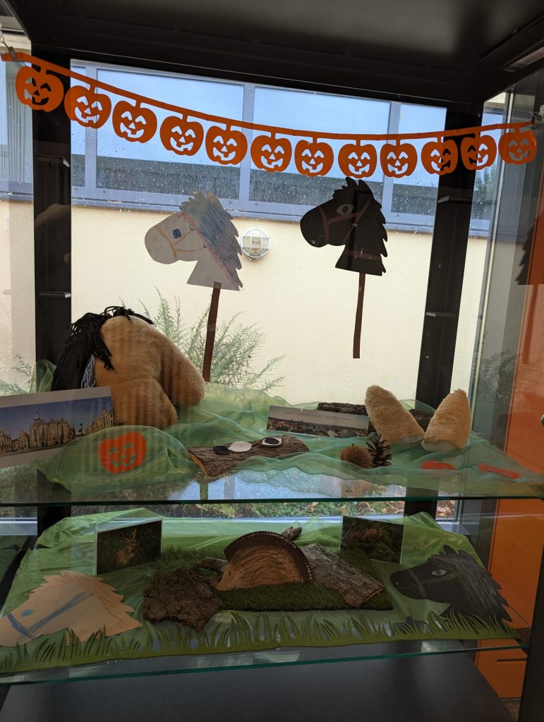 In unserer Vitrine auf dem Flur haben wir eine kleine Ausstellung zum Thema Steckenpferdreiten gestaltet.