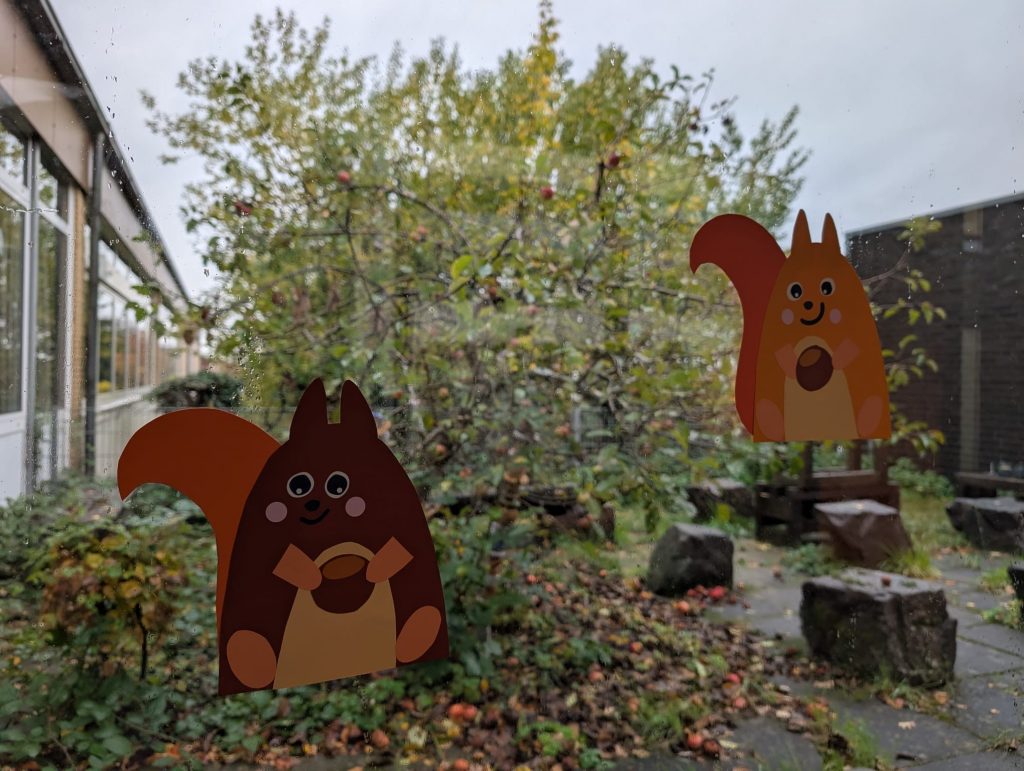 Kurz vor und in den Ferien haben wir unser Schulgebäude herbstlich dekoriert. Eichhörnchen, Igel und Drachen schmücken die Fenster.