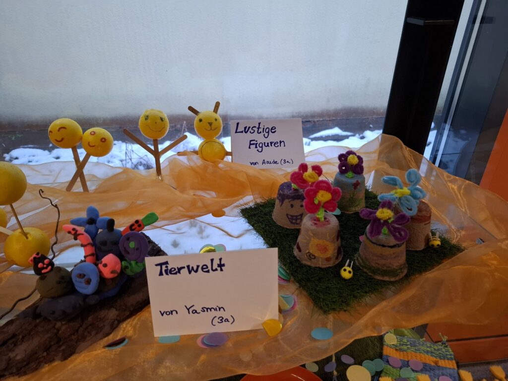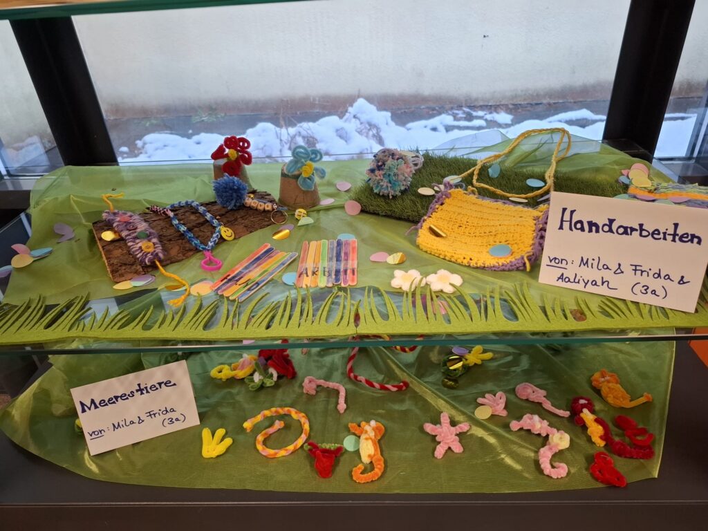 Mit viel Freude und Kreativität stellten einige Kinder der dritten Klasse tolle Kunstwerke für unsere Vitrine her (auf dem Flur im Schulgebäude zu finden). Dabei verwendeten sie ganz unterschiedliche Materialien. Mit großem Interesse bewunderten die Mitschüler die Handarbeiten, Meerestiere, lustigen Figuren, eine Tierwelt sowie den Osnabrücker Eiffelturm.